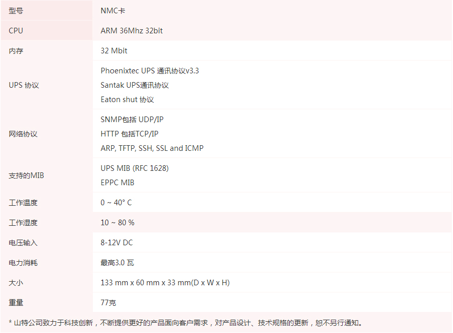 NMC 是一種介于UPS和網絡的設備,它可以從UPS獲得狀態信息并且發出指令。NMC支持兩種協議-簡易網絡管理協議(SNMP)和超文件傳輸協議(HTTP)以供使用者進入。通過SNMP的網絡管理站(NMS)和網頁瀏覽器,用戶可以獲得UPS的狀態信息、發出指令至UPS并且通過網絡設定NMC。