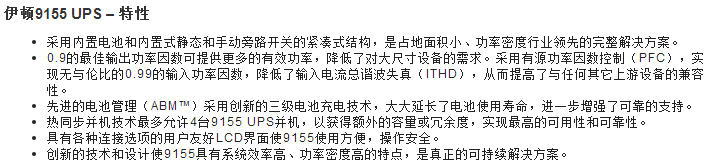 伊頓9155 UPS為公司企業、醫療機構、銀行和工業應用場合中的IT和電氣工程基礎設施或其它關鍵系統提供優質雙轉換后備電源和可升級的運行時間。9155 UPS可以用很小的占地空間提供最大的電池運行時間,是真正的全三相電源保護解決方案。