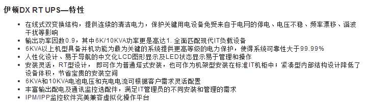 伊頓DX RT UPS可為關鍵服務器和網絡傳輸設備、IT機柜、電信通訊、VoIP等設備、銀行及安全系統、醫療系統、制造/控制系統、實驗室設備、精密儀器儀表等提供安全可靠的電力保護。Eaton DX RT的輸出功率因數高達0.9,可提供更強大的帶載能力, 與目前已普遍使用了輸入功率因數校正電路的現代型計算機設備相匹配,且輸入諧波小,綠色環保