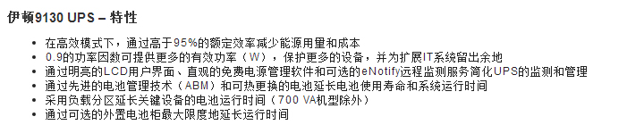 伊頓9130 UPS可為服務(wù)器、語音和數(shù)據(jù)網(wǎng)絡(luò)、存儲(chǔ)系統(tǒng)和其它IT設(shè)備提供在線電源質(zhì)量和可升級(jí)的運(yùn)行時(shí)間。通過高于95%的額定效率削減能源成本,9130 UPS通過先進(jìn)的電池管理技術(shù)(ABM)大大延長(zhǎng)了電池使用壽命。9130 UPS還有一個(gè)明亮的LCD用戶界面,可簡(jiǎn)化監(jiān)測(cè)。